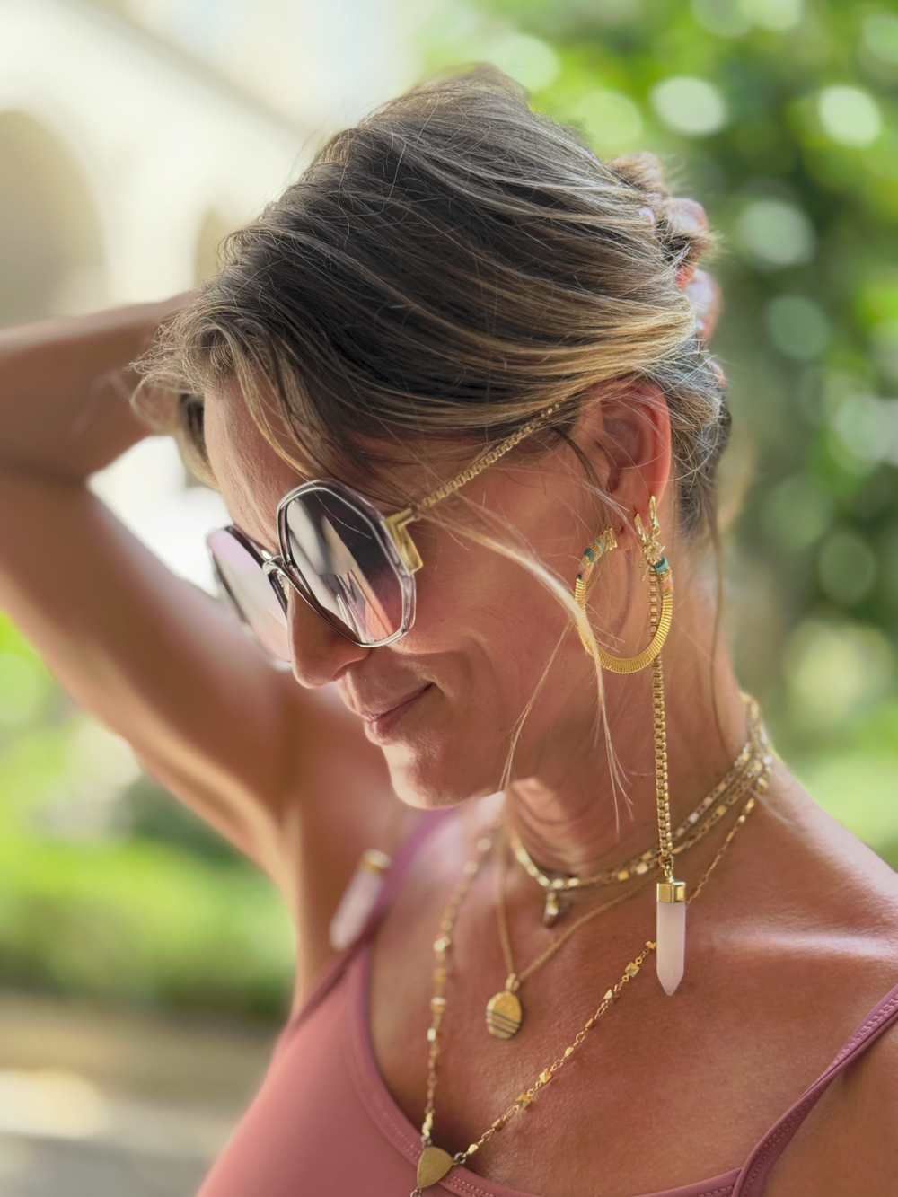 3. To convert to a necklace, set the frames behind your neck and loosely tie the chain together in front