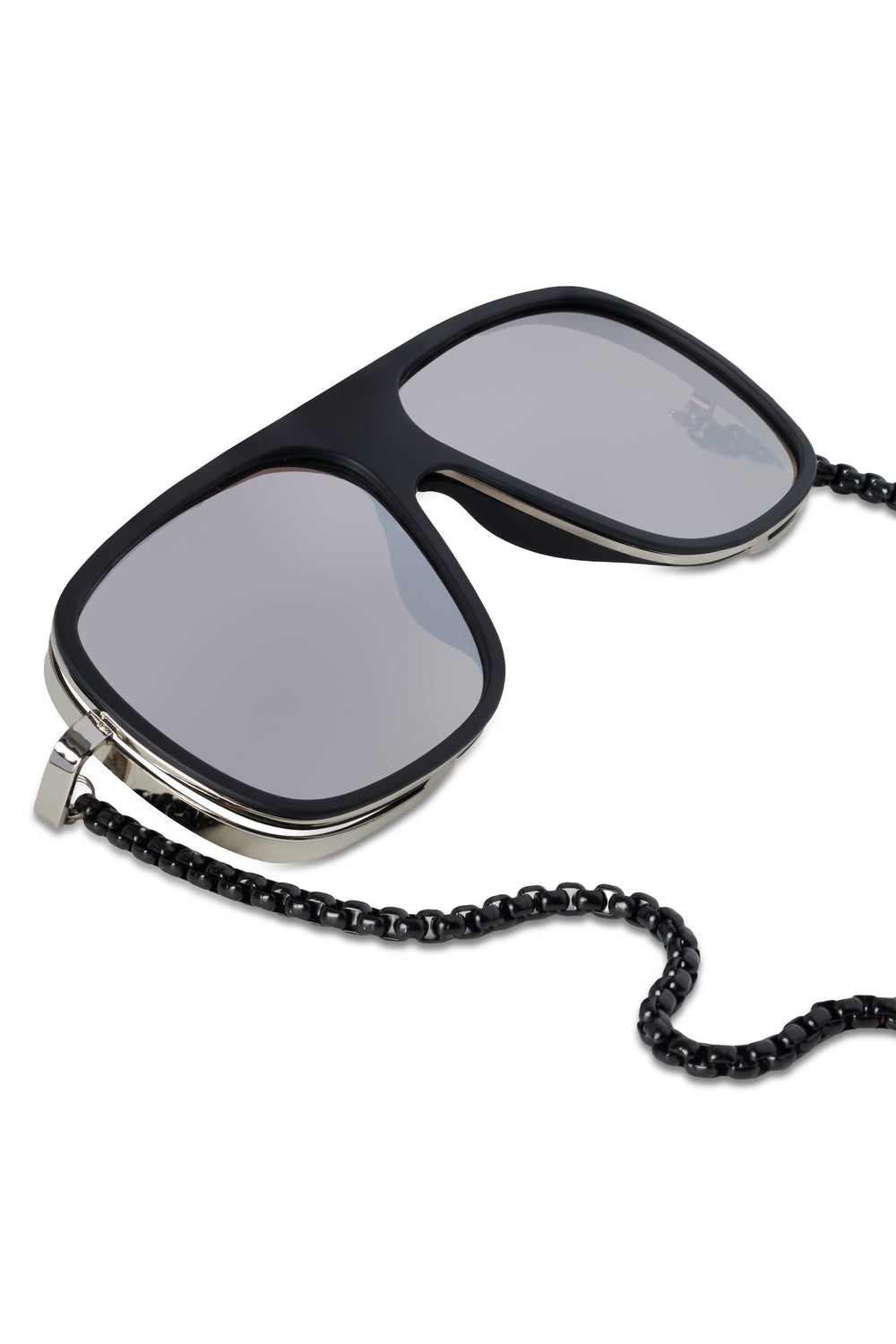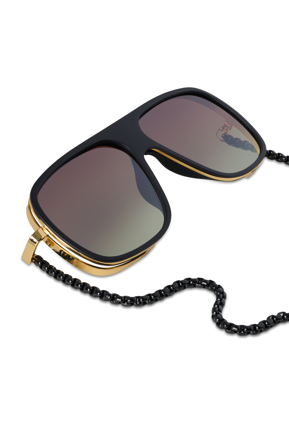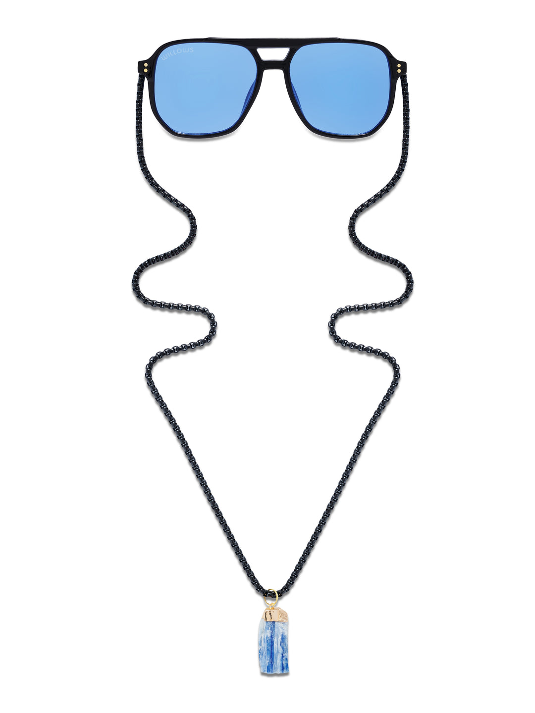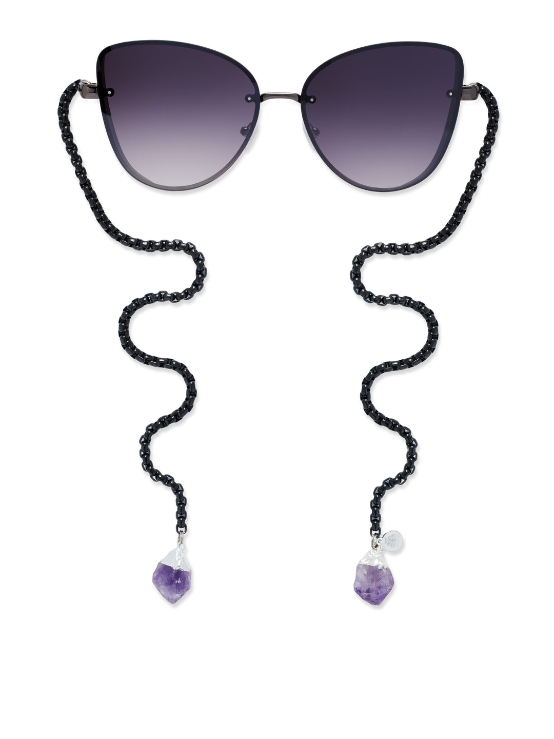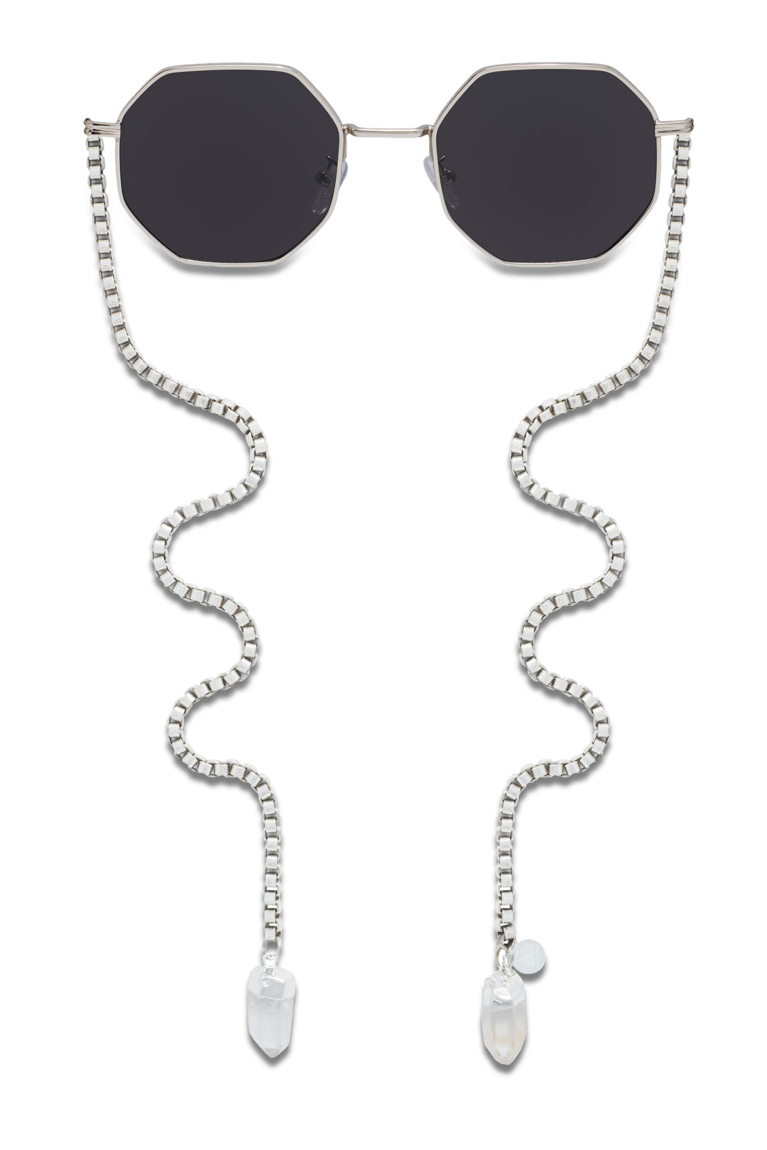 The original chain + crystal sunglasses that replace rigid arms with silky soft, flexible chains that sit lighter on your face and move with you all day. The crystal pendants double as earrings every time you put them on, and when the sun goes down, slide the frames behind your neck and let the chain fall into a lariat necklace.